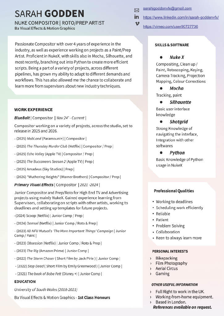 Hi, I’m Sarah!For the past Four years I have worked doing compositing for film, episodic and commercial projects, where I have developed a workflow which enables me to approach shot work efficiently whilst in a collaborative environment. Also, outside of work I have an Interest in gaming which, I feel offers keen insights in technical graphics and use of immersive visuals.If you'd like to contact me you can find my links and my CV below.